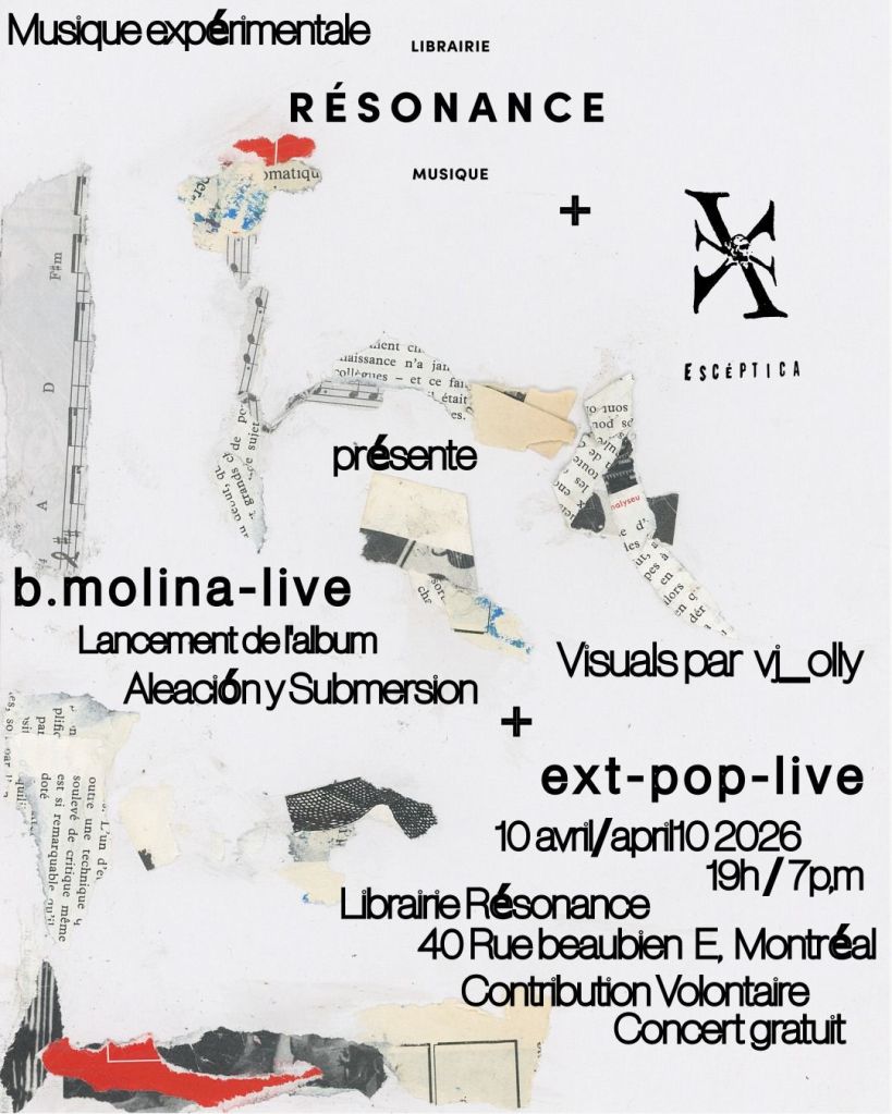 Librairie Resonance and Escéptica Records present the release of the album Aleación y Submersion by B. Molina. To celebrate the release, B. Molina and ext-pop will present two performances of sonic experimentation, accompanied by visuals by Olly Canoli. Join us at Librairie Résonance on April 10 at 7 PM for a session of sonic experimentation, exploring sound continuums and noise-oriented practices.